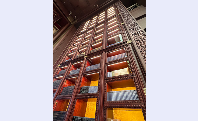 国家书房单元书柜,高9米、宽3.3米,被衬黄色宋锦,四周以木雕缠枝莲图案装饰