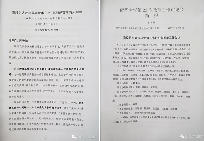 2009年7月8日一2010年7月8日,第23次教育工作讨论会,本次会议以“清华新百年人才培养的使命与战略”为主题。校长顾秉林做《坚持以人才培养为根本任务,再创新百年育人辉煌》的报告,报告重点阐述“人才培养是大学的根本任务”核心理念,并希望全校师生广泛动员、积极参与,面向未来、形成共识,精心安排、认真落实。要发动全校解放思想,进行历史的、大跨度的、深入的反思,力争在办学理念和人才培养模式上有大的突破。