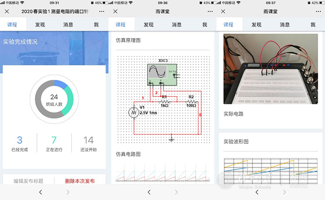 朱桂萍老师的“电路原理”小班完全翻转课堂的主要特色之一,就是同学们可以基于便携式实验设备完成大量与理论课融合的实验。为了及时了解同学们在课外完成实验的情况,朱老师从2016年起就开始与雨课堂合作开发“雷实验”(取自汉语拼音LEI,Lab of Electronic Intelligence)智慧实验平台。基于这一平台,教师可以在手机端通过微信布置实验、跟踪学生实验状态、接收学生提交的实验结果,学生也可以按照教师设定的实验流程完成实验,并对实验中每个步骤进行截屏或拍照,最后自动生成实验报告,提交实验数据。开课前,朱老师把实验设备(图1)和配套的元器件通过快递发给了同学们,并在课堂上通过视频给大家讲解了设备的基本操作(图2),课后很快就在手机上看到了全班同学当前的实验进展状况(图3),同学们发过来的在家做实验的照片(图4)也说明大家相当投入。