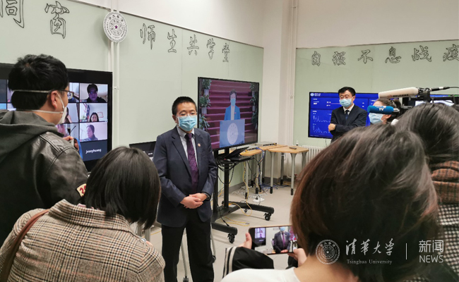 在位于清华法律图书馆地下一层的教学指挥中心,室内环绕的大屏幕实时滚动播放着当天课程的各项数据和教学动态。杨斌、彭刚向记者们介绍了学校全面在线开课的总体情况和特色做法,分享了学校和师生为保障在线教学顺利进行的动人故事。学堂在线首席运营官、“雨课堂”技术负责人王帅国展示了在线教学平台,记者们现场连线了正在讲授本科生专业课“交互设计”的美术学院教师付志勇,并与师生们“面对面”互动交流。
