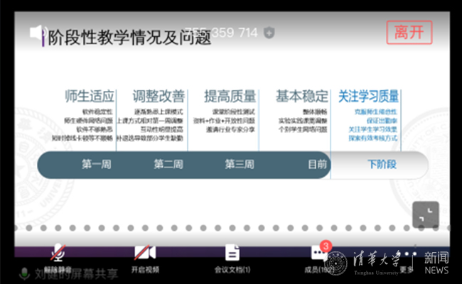 助教及学生代表郝治翰、曾云辉分别分享了对在线教学的感受。“中国马克思主义与当代”课程助教郝治翰说,在课前准备阶段,助教们积极调整心态,自觉参与岗前培训,协助教师制定应对方案,密集进行课前测试,成为师生间的教学桥梁,为在线教学期间师生同心、同向、同行打下了良好的基础;另外,部分课堂因有国际学生,涉及多个时区,助教们不断沟通协调,协助搭建起了“教学联合国”,也保证了课程的顺利进行。学生代表曾云辉分享了自己在线学习的感受,他认为在线教学期间,清华教师对教学的认真负责、课堂上的讲解互动、课后的反馈调整,无一不展示着有质量更有温度的清华课堂。“宅家上课,在线科研,读书打卡,积极锻炼”正是每位清华学子在这个阶段的写照。