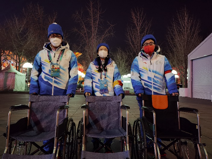 迅速响应,移动助行分队火速上岗。在冬残奥会期间,由19名同学组成移动助行小分队,承担起了专门为轻度残疾、腿脚不便、突发伤病等出行不便的观众提供轮椅接送服务的重要临时任务。轮椅助行员每人配备一副轮椅,需要第一时间主动识别、引导有需求的观众,将他们从残联落客区接送至看台区,力求提供最温暖、最贴心的服务。他们的足迹分布在场外的路上,基本看不见场内的精彩;但场内的精彩,离不开他们细致体贴的服务。