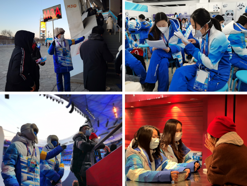 全面服务,全力以赴各显神通。除了赛事服务,场馆服务组冬奥志愿者还遍布在开闭幕式运行的各个业务领域,他们自1月中旬起每日前往鸟巢全面参与各项筹备工作。“学以致用,活学活用”,他们将自身专业知识发挥得淋漓尽致。服务于公共卫生领域的计算机系2021级硕士阎华毅编写了一个健康监测数据获取程序,实现全场馆人员健康状况的实时监测;来自工业工程系的2019级博士生唐海景设计了可同时作业的5条流水线,短短4个小时完成10000多个观众礼包的装袋工作;技术业务领域的志愿者运用专业知识和器材检查无线技术设备、排查定位信号干扰,并与国际奥委会工作人员进行专业沟通。更多志愿者们孜孜不倦,以简单而不平凡的工作助力冬奥盛会。场馆通信中心志愿者开幕式当日速记700多条超20000字对话内容;品牌形象与赛事景观志愿者场馆内外细心地巡查每一处景观;注册志愿者总是“多想一步”,在冬奥会中后期已经启动冬残奥会的证件注册工作;人员管理领域志愿者一遍遍精准核对人员考勤状态数据;作为“志愿者二次方”的志愿者领域志愿者为1800余名志愿者提供服务保障;宣传志愿者虽然大部分时候只是承担对接工作,但有力协助媒体记者为精彩纷呈的节目提供官方解读,帮助世界观众“读懂中国人的浪漫”!