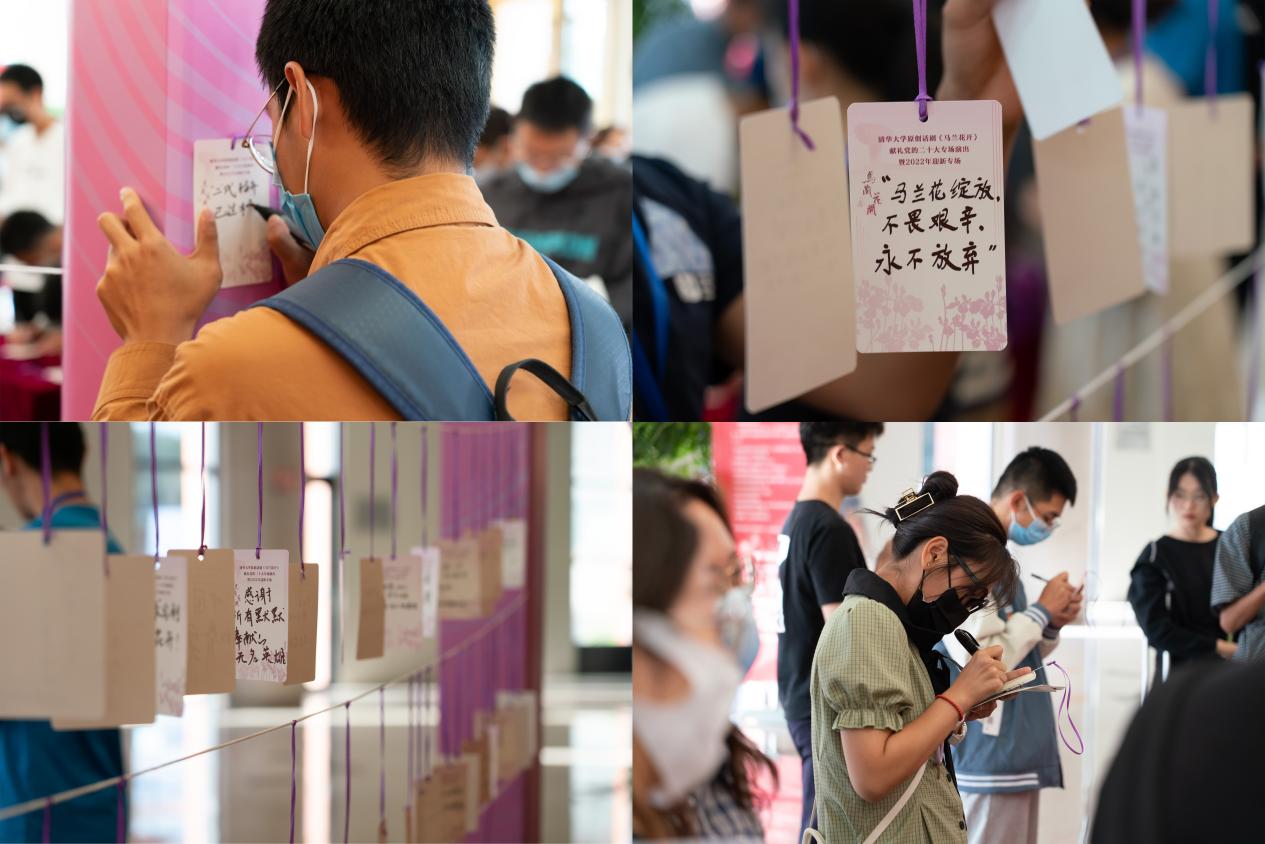 作为思政教育与美育协同育人的重要呈现方式,《马兰花开》不仅感动着观演观众,更深深影响了剧组演职人员,持续近一个月的排练对于每一位剧组成员来说都是一场生动的主题教育、一次深刻的精神洗礼。剧组演职人员均为在校学生,其中一半的同学为第一次参加剧组排演。正是一代代“花开人”的投入与付出,才能使“花开精神”在清华园中得以延续。剧中饰演钱三强的2022级车辆学院硕士新生熊宣威说:“三年前我作为一名景片演员参与到《马兰花开》剧组中,三年后我再次进入剧组,从幕后到台前成长为一名角色演员。无论台前幕后,我都希望能够通过我们的努力,将共和国脊梁们的科研精神、奉献精神传递给更多年轻人,以实际行动迎接党的二十大胜利召开。”担任舞台监督的2019级人文学院本科生张渊沫说:“这是我与‘花开’结缘的第四年,从服装助理到舞台监督,尽管从未走到灯光下,但剧组的每个人,都像一株小小的马兰花,或许花期不同,但接续不息,扎根在了清华园这片‘戈壁滩’上,‘功成不必在我,功成必定有我’的精神品格,也必将铺陈出为祖国、为人民无私奉献的精神底色,伴随我们奋斗一生!”