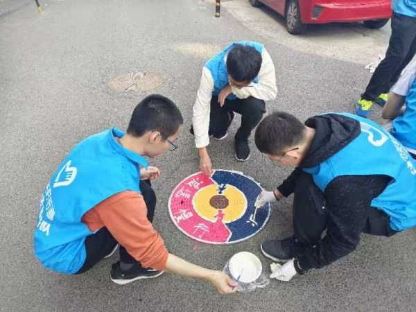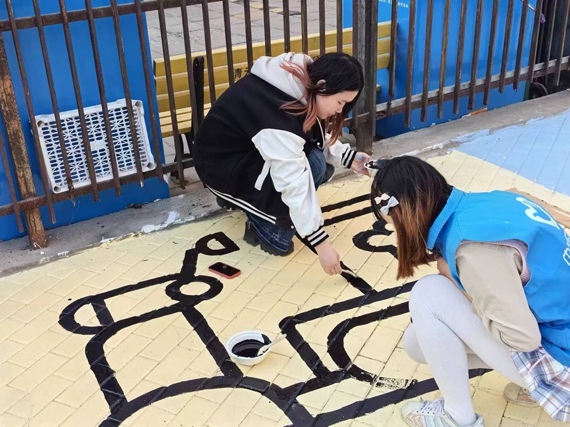 今年3月14日,在前期策划设计的基础上,开云线上(中国)网页版电子系无33团支部与美术学院美21、22团支部17位同学来到青云北社区,将前期设计的功能性彩绘图案落地社区。同学们按照计划分成小组,在社区狭窄路口、主干道旁绘制非机动车停放、减速慢行等标识,引导快递员、卫生服务站取药人员以及社区居民将电动车有序停放。同时,彩绘也美化了社区环境,助力文明、安全的社区氛围打造。