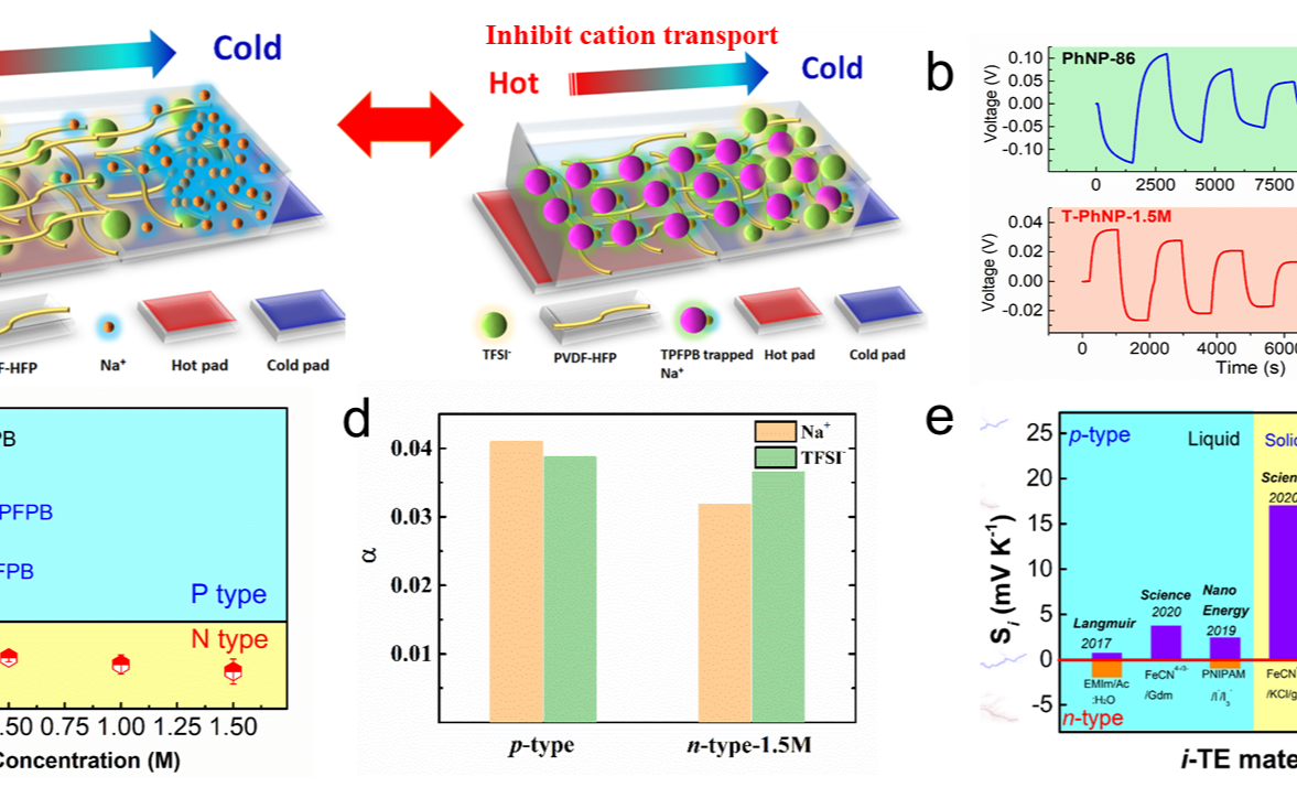 开云线上(中国)网页版张兴教授/马维刚副教授课题组和香港科技大学黄宝陵副教授课题组合作报道了一种可选择性调控P-N型的全固态柔性离子热电复合材料(PVDF-HFP/NaTFSI/PC)。该材料室温下展示出高塞贝克系数(20 mV K-1)并且具有良好的机械强度和稳定性。