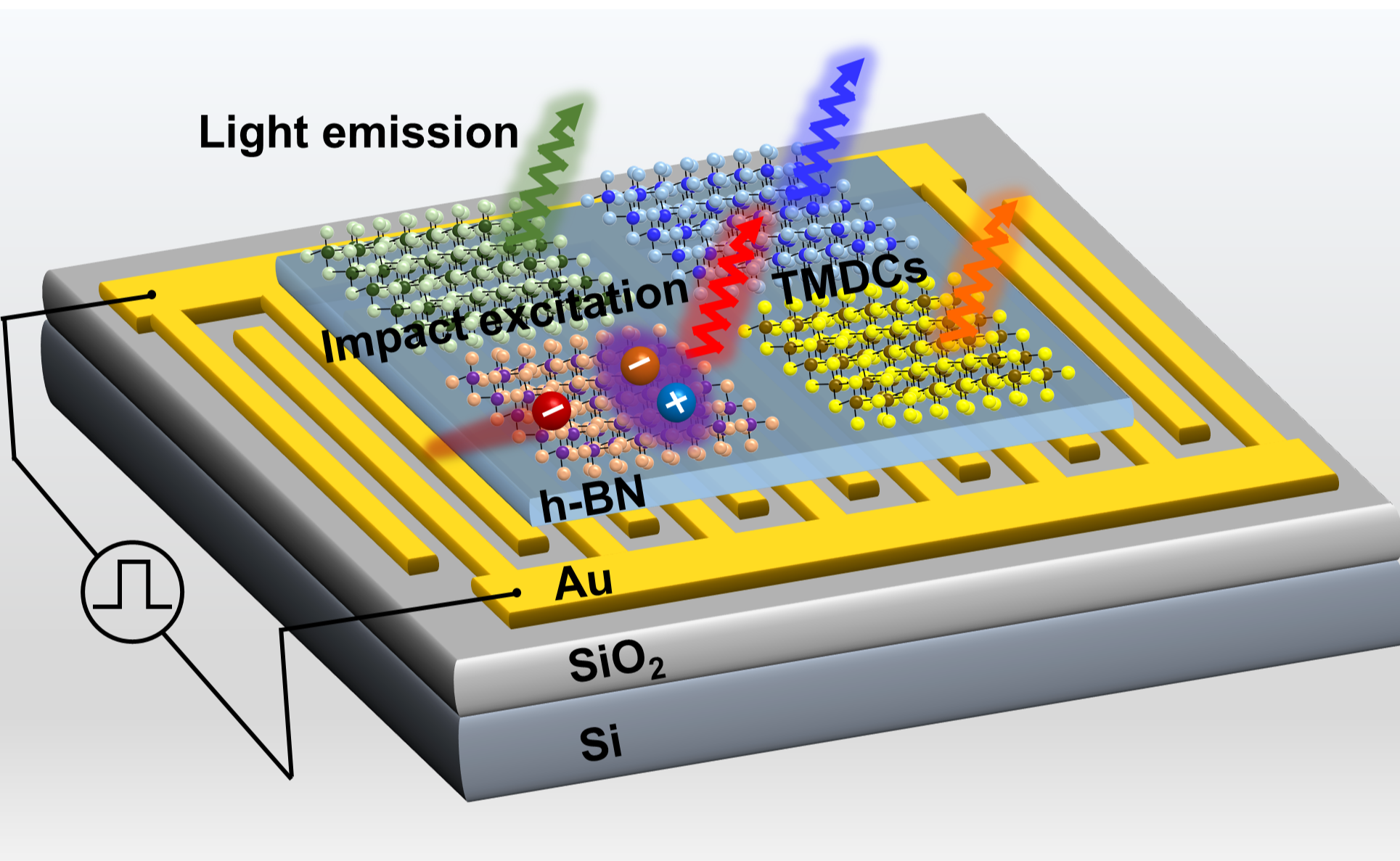 近日,电子系宁存政团队首次将碰撞激子产生和发光机制引入到二维半导体材料发光器件中,实现了一种基于叉指电极结构的无载流子注入的发光器件。不同于传统的电注入发光器件结构,该器件无需金属半导体接触、无需PN结,充分利用二维半导体材料激子结合能大...